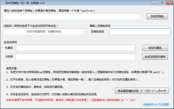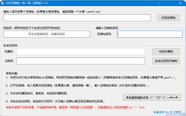 RAR压缩包一机一码是一款RAR解压包加密工具,适用于发布资源,不但能防伸手党、搬运党,还能避免没人回帖的尴尬,软件分为加密端和解密端!