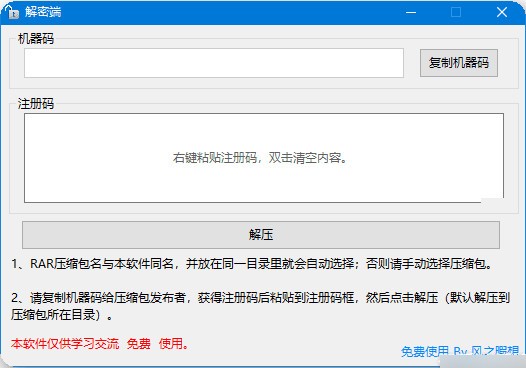 2、请复制机器码给压缩包发布者,获得注册码后粘贴到注册码框,然后点击解压(默认解压到压缩包所在目录)。
