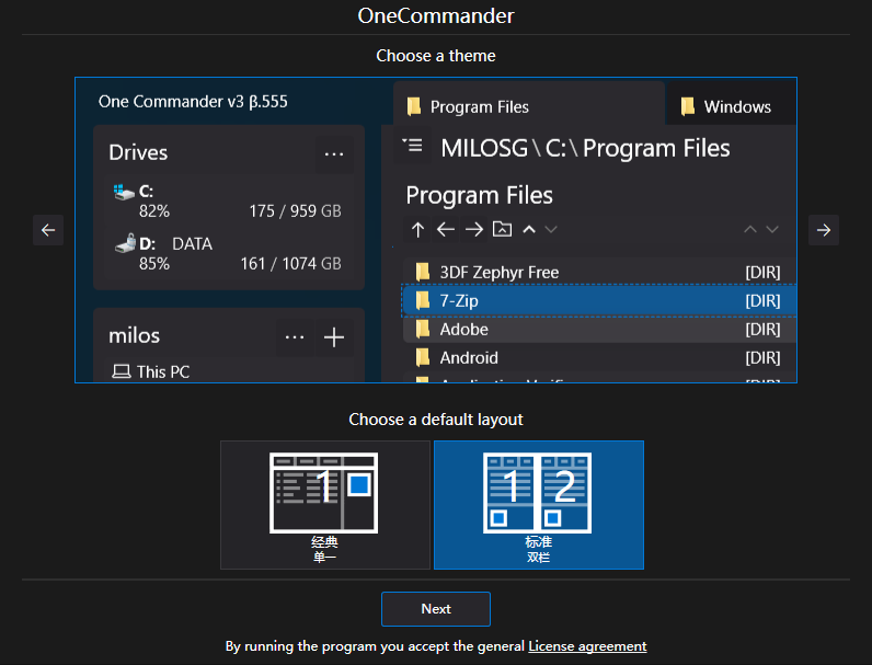 1、下载安装并打开OneCommander,选择【标准双栏】,点击【next】