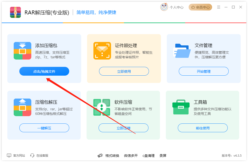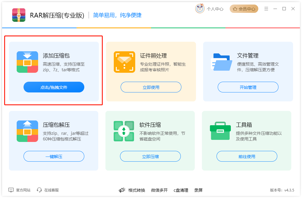 Step1、电脑上选中多个文件拖拽到软件以下位置,或点击「添加压缩包」选中电脑多个文件(按住Ctrl键多选);