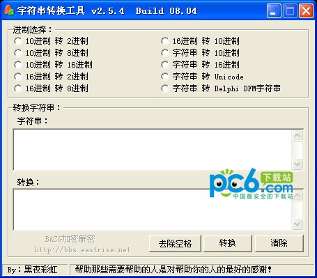 字符串转换工具是一款绿色安装转换速度飞快的进制选择转换器,使用这款字符转换器能够保持文字到字节数集、字节数可以集到文字集中间的互相变换,内含多种转换工具,如10进制转2进制,16进制转10进制,10进制转16进制,字符串转10进制,字符串转16进制,字符串转Unicode,字符串转Delpho DFM字符串等,十分强大!