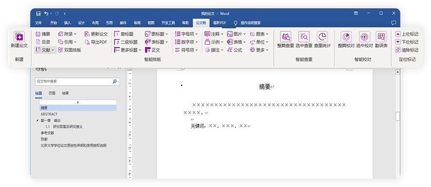 多样式论文工具-从摘要到附录,从章标题到正文,从公式到图表,20余种论文排版、写作工具,鼠标点击即可一键调整格式,帮助同学们轻松调整论文格式,准确、快捷、不容易出错。导师们也不用反复确认学生论文格式了。帮助您将主要精力放在论文写作与逻辑上,而不是在调整格式上。