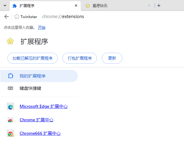 3、星愿浏览器兼容chrome、edge浏览器的扩展,在此页面的右上角启用开发者模式,之后将下载的扩展拖动到此页面就能完成安装