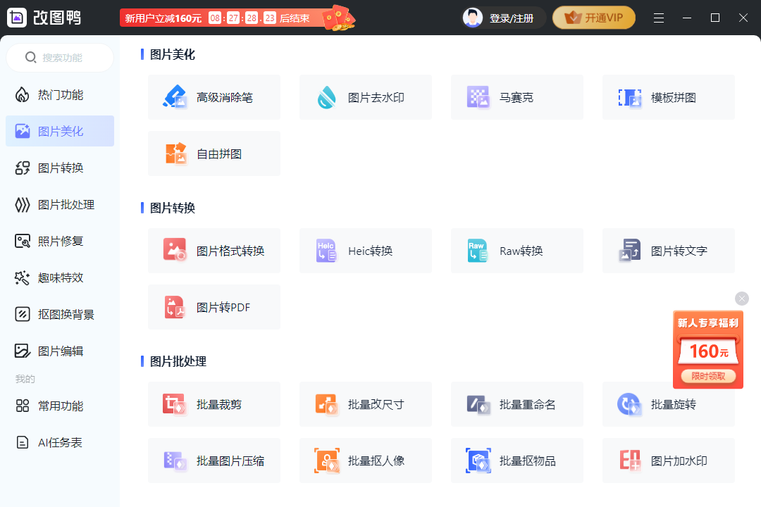 改图鸭的图片处理工具齐全,图片编辑、转换、批处理、修复、美化等需求都可以满足,界面简洁,操作便捷高效