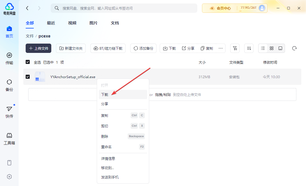 1.超大空间,超速下载:普通用户享受10GB永久有限空间,SVIP用户支持6T空间,大文件上传支持100GB,珍藏的蓝光电影,学习资料,一键存到网盘不丢失;下载速度快SVIP高达50MB/s大文件下载再也不用等,日常转发的课件资料、办公软件,随用随下,还支持解析磁力链和BT种子,大文件一键存网盘