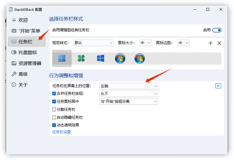 我不想改变开始菜单栏样式,只是想使用这个软件让任务栏透明或者不合并等其他的操作吗?