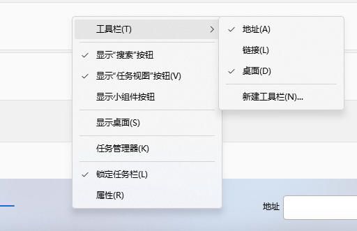 此时任务栏就和Windows10一样了,然后右键点击任务栏,就有工具栏选项了。就可以选项新建工具栏了。