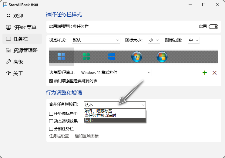 安装Startallback后,我们在软件的设置界面左侧选择任务栏。然后合并任务栏按钮选择【从不】。