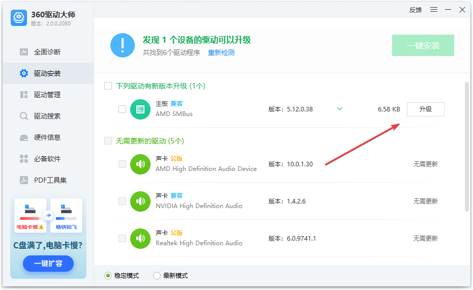 1、打开360驱动大师后,在驱动安装界面可以自动扫描需要升级或缺失的驱动