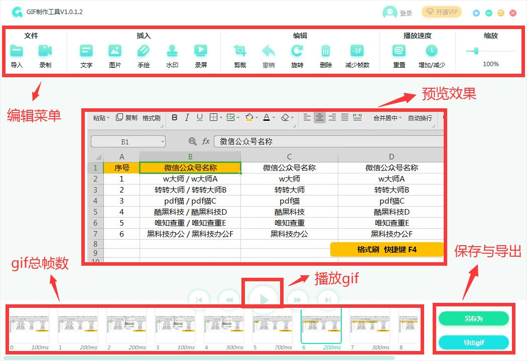 Gif制作工具软件使用界面分成“编辑菜单按钮”“效果预览”“总帧数列表”“保存与导出”“播放按钮”几个部分,以下的使用操作说明将从这几个方面来讲解。