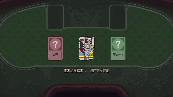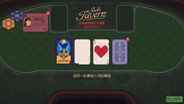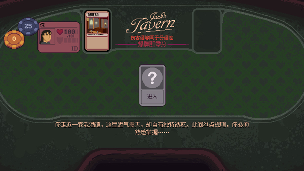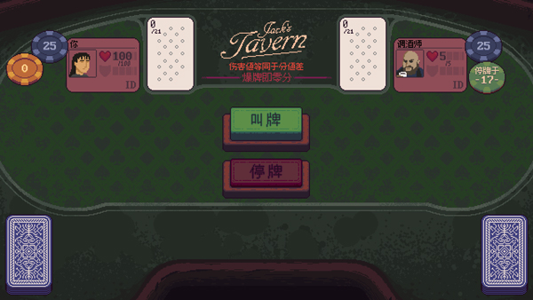 3、玩家需与NPC进行比赛,通过叫牌来抓取扑克牌,最接近21点的玩家则获胜,超过21点则自动爆牌输掉比赛,对手爆牌则攻击对手与自己卡牌点数相同的血量,双方均无爆牌则以差值攻击输掉的玩家。