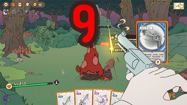 8、大铁棒火铳在强化后会具有“回响”特性,当玩家拥有大量费用时,就会产生霰弹枪连发的超强视觉效果,最后还可以用一发来自大铁棒的物理攻击作为谢幕结束,这让玩家宛如置身于“DOOM”,令卡牌游戏也可以热血酣畅。