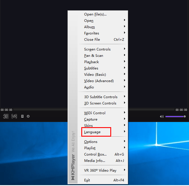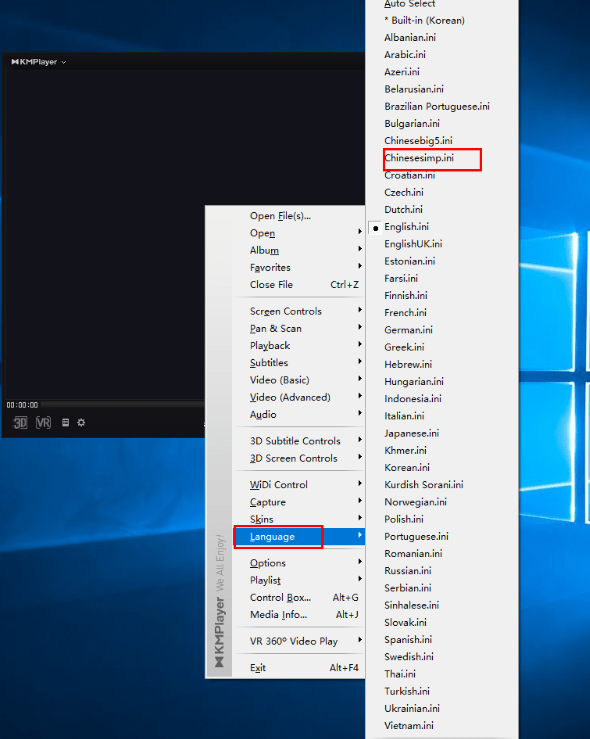 2、鼠标右击播放界面,我们在选项卡中选择“language”的选项。随即,在language的语言列表中选择“chinesesimp.ini”。