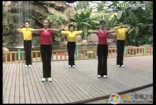 1左脚向左一步,稍宽于肩,同时两臂侧平举,掌心向下;