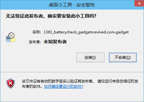 点击“小工具库”窗口底部的“联机获取更多小工具”即可打开Gadgets Revived网站下载其中的各式各样的小工具,下载下来的小工具安装文件为.gadget格式,双击运行会打开如下图所示的安全警告窗口“无法验证此发布者。你确实要安装此小工具吗?”提示的话点击“安装”即可把这个小工具添加到Win10桌面右侧,并同时显示在“小工具库”窗口中。