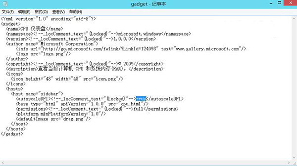 3、使用记事本来打开这个gadget.xml文件,将true这一行中的ture改为false,然后保存修改,并选择将该文件保存到桌面。然后在从桌面上拷贝到文件夹中替换掉原来的文件。好了,现在就可以正常显示小工具了。