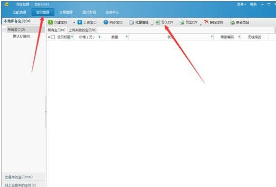 7. 进入“宝贝管理” 点击 导入CSV,然后导入,我们已下载的数据包,如下图所示,