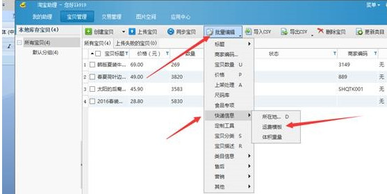 8. 宝贝导入成功后,点击 “批量修改”按钮,来批量修改运费模板,如下图所示