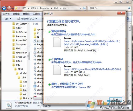 3、安装完成后,打开“”目录,将破解文件“”复制到安装目录Bin文件夹下,默认安装为C:\Program Files\IBM\SPSS\Modeler\18.0\bin