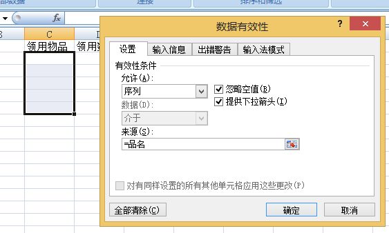 然后选中领用总表的领用物品列,设置数据有效性为序列,来源=品名;这样物品就只能选择物品表里的物品了
