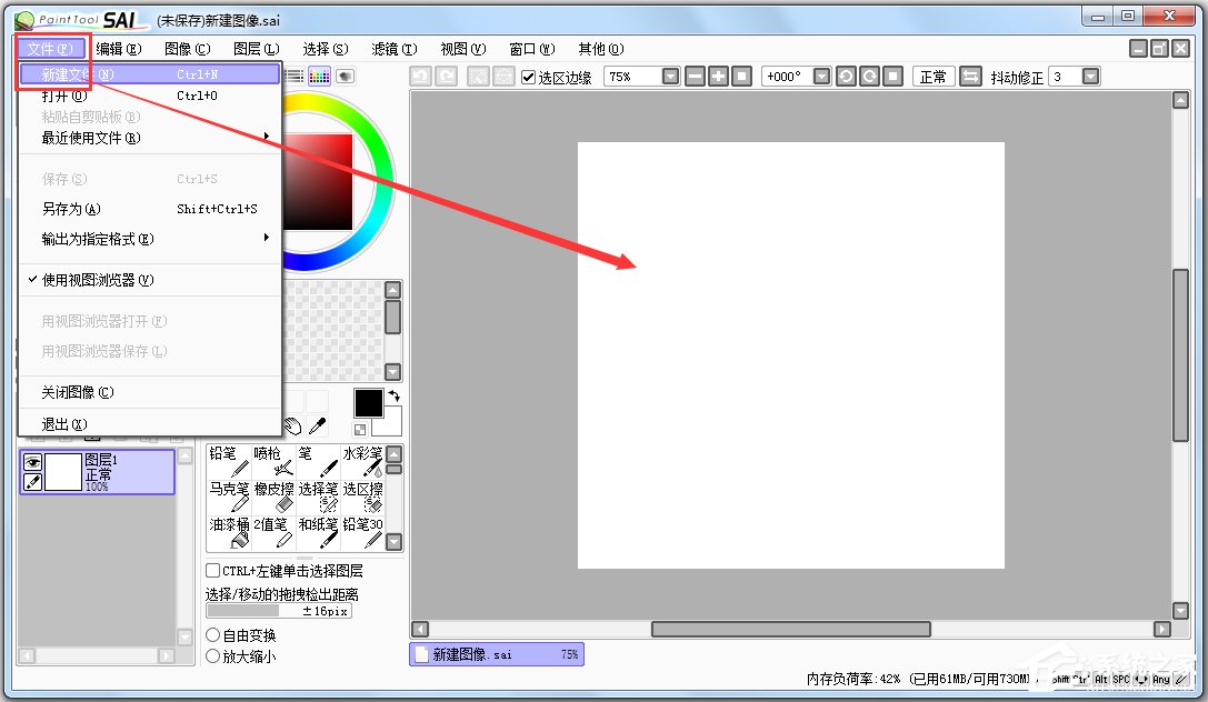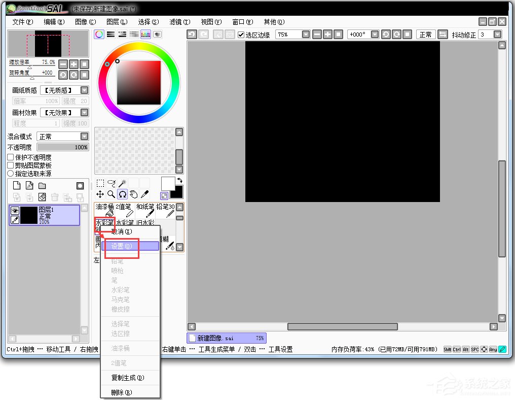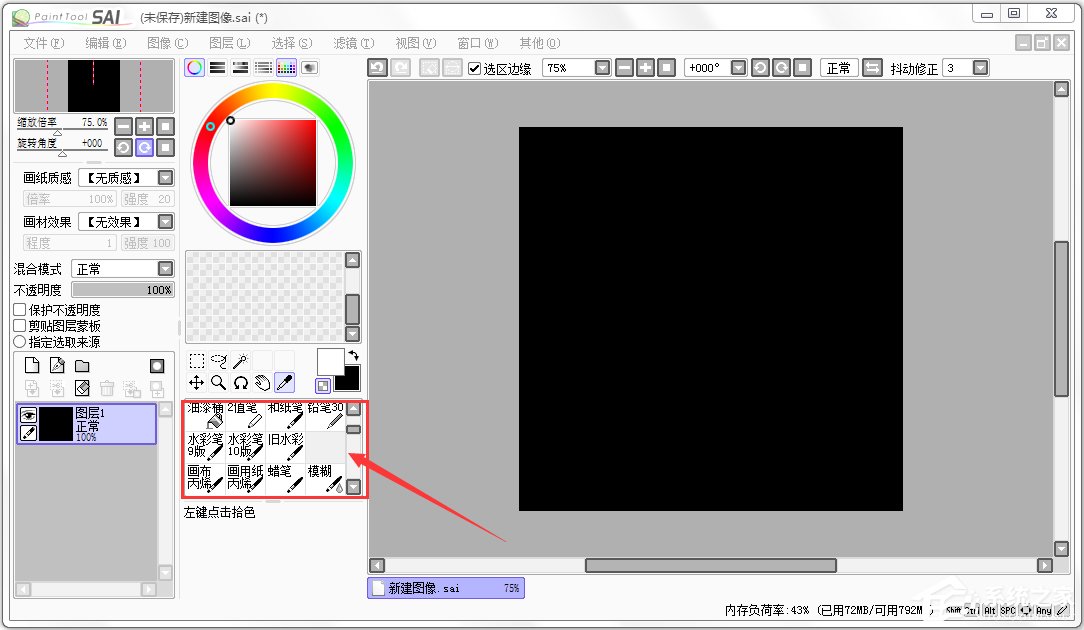 很明显,SAI并不是使用传统的explorer界面,而是使用了自己设计的UI界面。优势是有些很人性化,有些则很不人性化。SAI的界面可以按照功能分为5个部分:导航区、图层区、绘图区、颜色区、工具区。