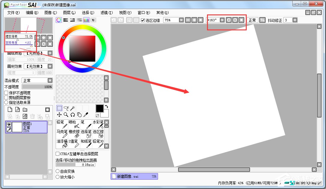 3、SAI独有的一个优势是可以高效地、自由地旋转画布视角。