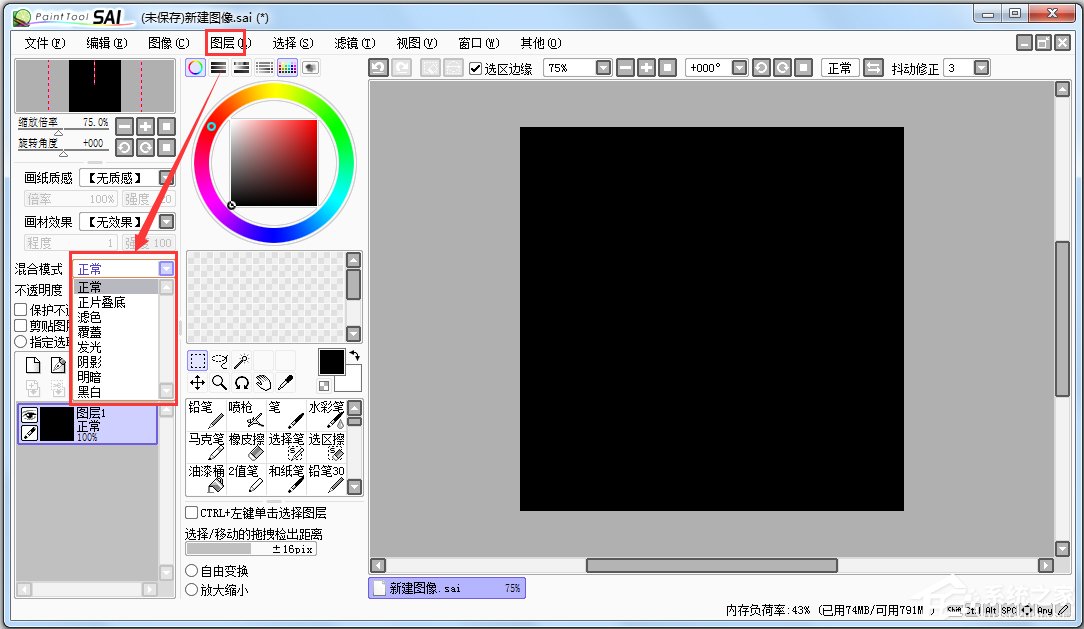 SAI默认记录的历史步骤容量大约是100M。图层区和Photoshop类似,你可以看到8种效果截然不同的混合方式,已经很足够用了。
