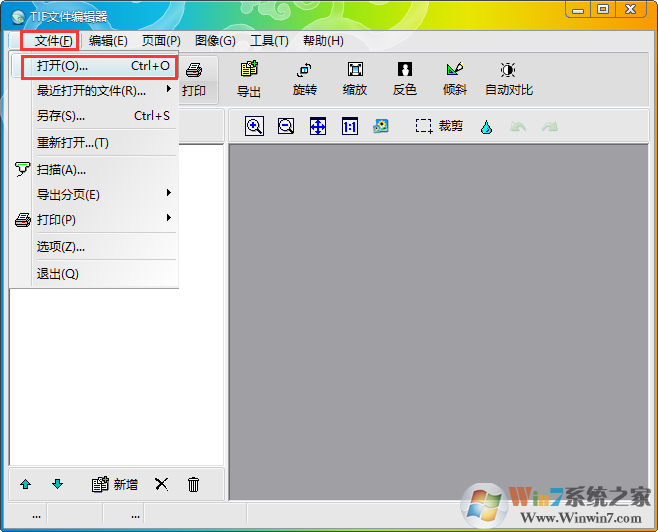 1、打开TIF编辑器之后,在文件下拉选项中有打开、另存、扫描、导出分页、打印等选项,我们可以点击打开选项将需要编辑的TIF文件添加进来。