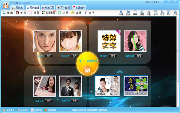 可牛影像是一款完全免费的专业图片处理软件,操作简单,无需任何技巧就可以快速的进行图片库管理、强大照片美化处理,内置海量的素材资源,数千张精彩场景、非主流可爱饰品、影楼特效等,轻松制作支持多图场景,让您轻松成为数码照片处理专家!