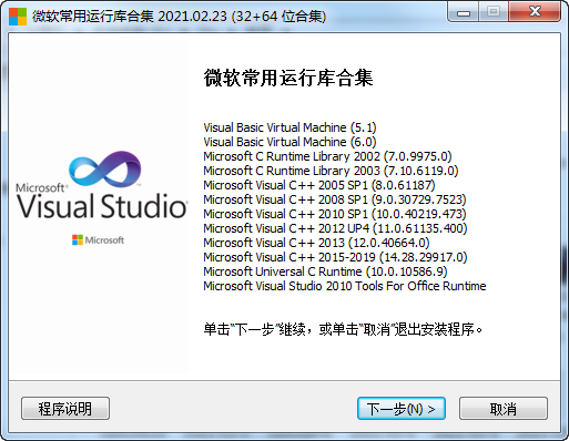 微软常用运行库合集安装包由大神采用微软原版运行库(均通过微软验证)的VC++所有版本整合而成,方便用户一键安装所有软件游戏所需要的运行库,安装简单,智能识别!并且长期更新!是目前最受欢迎的运行库合集,欢迎下载使用!