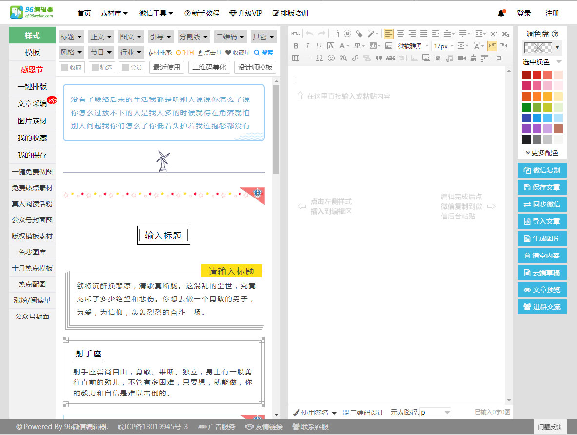 微信96编辑器是一款适用于微信公众号小编使用的内容的排版工具,内置海量样式、模板、图片素材等内容,帮助你在进行发布公众号文章的时候帮助你排版精美内容,从而获得收获更多粉丝的关注。这款96公众号编辑器完全免费,简单易用,是搞公众号用户非常不错的一款写作编辑工具!