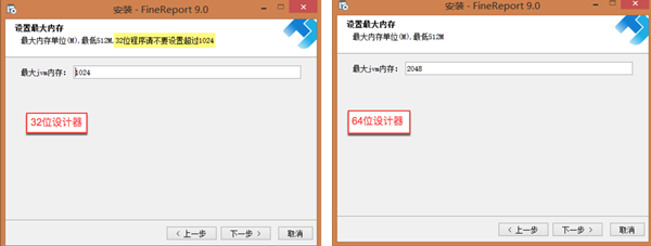 点击浏览,选择文件安装的目录后(建议选择非系统盘目录)点击下一步按钮,弹出设置最大jvm内存设置的窗口,根据是32位设计器还是64位设计器进行设置,如下图: