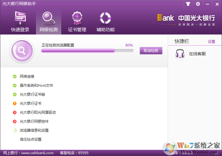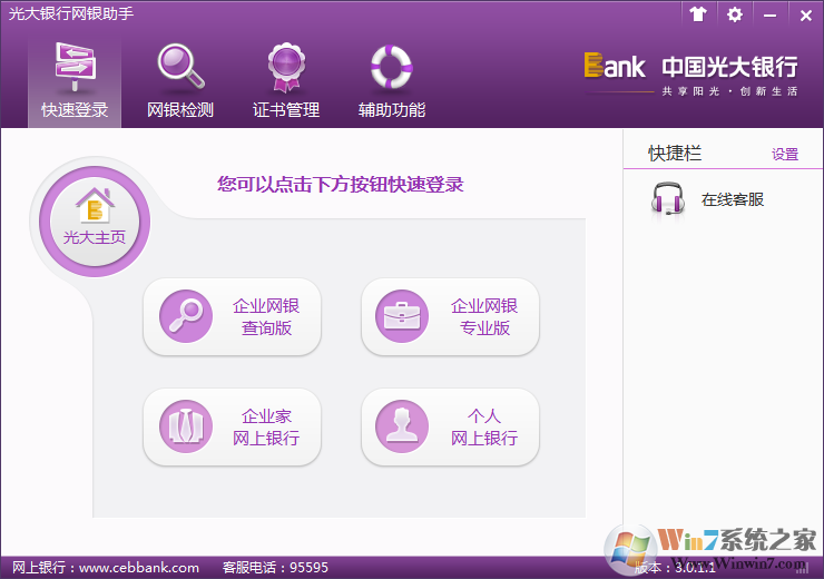 光大银行网银助手是光大银行官方专为本行用户推出的一款网上银行环境设置工具,可以全面的检测用户的网上银行使用环境,有效的防止各种因为木马或者病毒导致的网银信息泄露,有效的保护了大家的网银安全,放心交易!