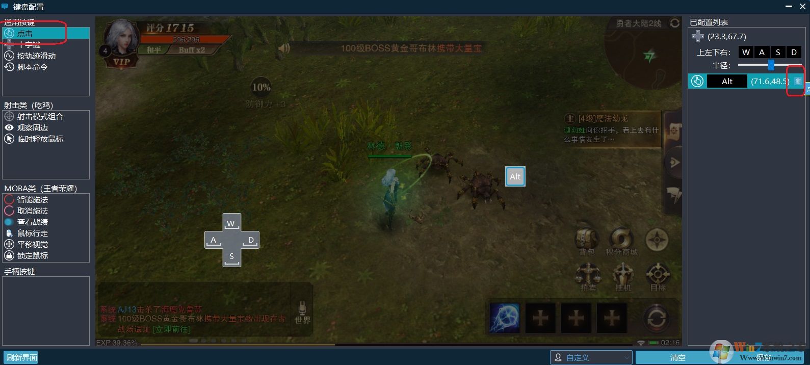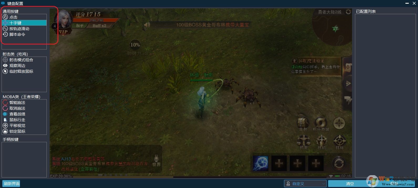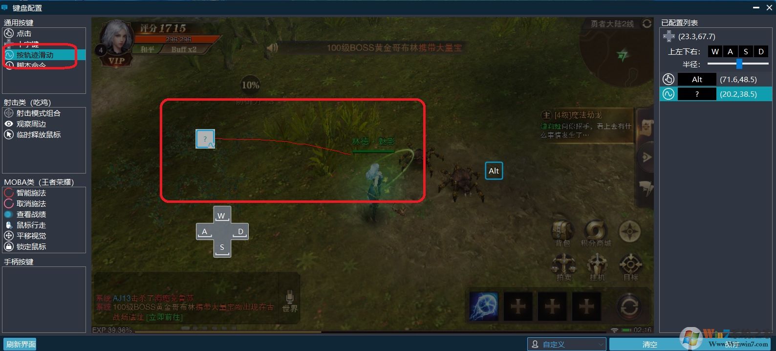 普通按键,拖拽按钮出来,然后按一下键盘相应的按键,然后保存,即可完成配置。滑动操作则是拖拽出来后,在屏幕画一条操作轨迹,然后按下键盘,例如K,保存后,按键盘K,则代表操作已设置的轨迹操作。
