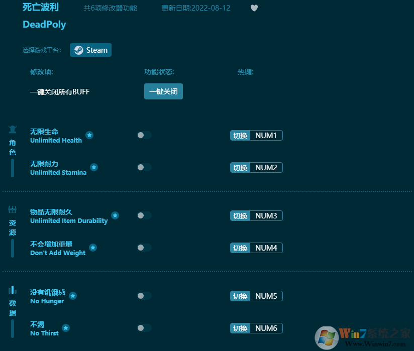 死亡波利修改器是针对死亡波利游戏推出的多功能修改器,可以让玩家在玩这款游戏的时候更加轻松,修改器可以修改游戏中角色属性,包括了让你不会死的无限生命、无限耐力、物品无限耐久、不会增加重量、不渴、不饿等等,可以说是一款非常棒的修改器,而且是中文的使用起来并没有什么难度。