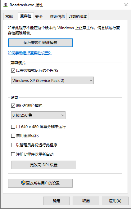 属性对话框中的选项,勾选“以兼容模式运行这个程序”,以及“用256色运行”
