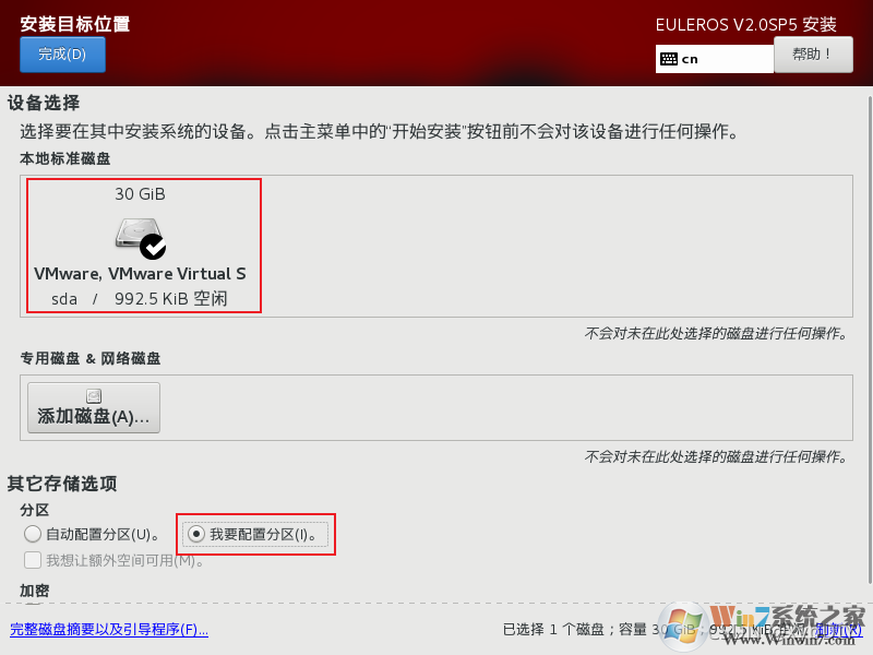 (2)选择要安装的磁盘,点击“我要配置分区”,点击完成,进行下一步操作。