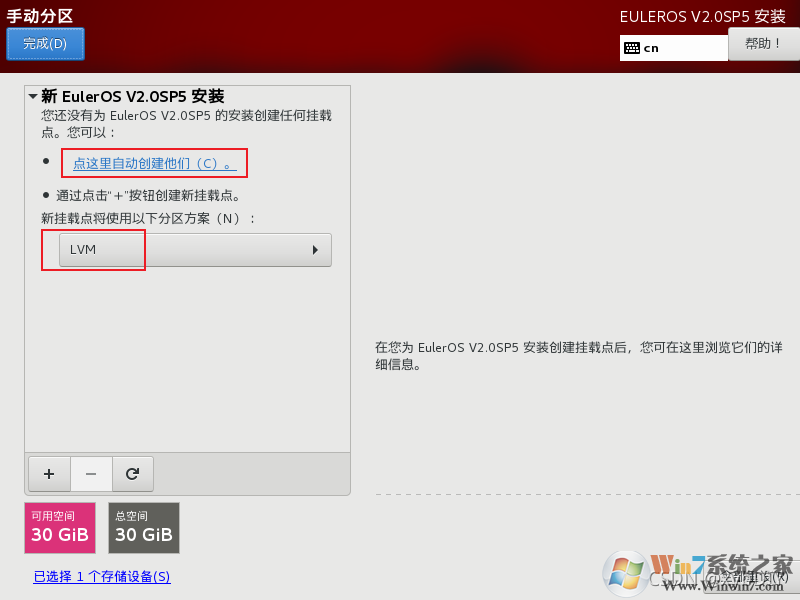 (3)选择LVM,点击“点击这里自动创建它们”。