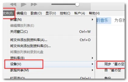 4、在界面中点击右侧数据同步或者通过点击iTunes上方“文件”,下拉菜单的“设备”找到“同步”选项,进行同步;