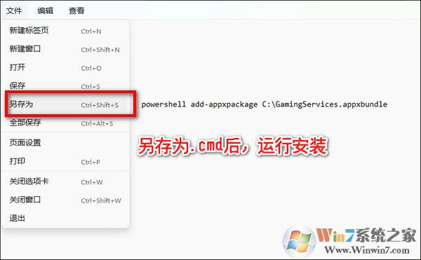 2、如果直接双击无法安装,试试新建txt文本,输入【powershell add-appxpackage C:\GamingServices.appxbundle】,保存,并将后缀改为cmd,启动这个cmd程序安装