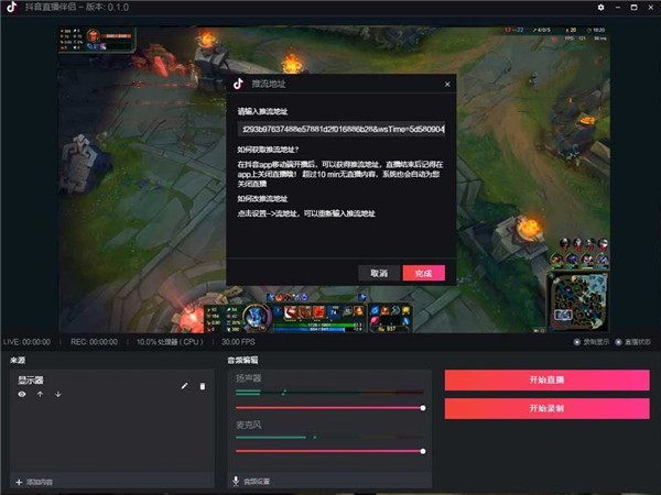 11、在弹出的推流地址窗口中输入你的抖音直播地址点击完成即可开始直播,这时候你可以最小化抖音直播伴侣开始直播了