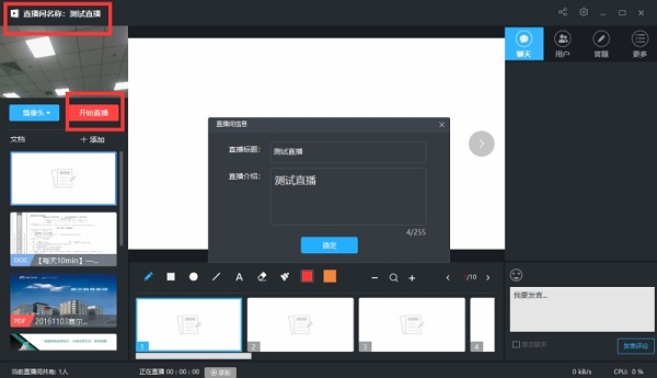 点击开始直播按钮后,输入完标题简介,点击创建直播即可开始直播。