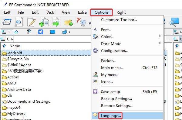 1、下载EF Commander便携版解压后打开,点击菜单栏的options—>Language