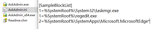 5、通过编辑AskAdmin.ini文件的[SampleBlockList]块下的列表,可以添加程序到 扩展 - 阻止Windows组件 列表中。根据范例可以看到它支持通配符 * 和UWP应用。