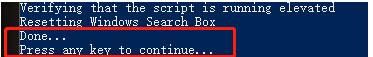 8. PowerShell脚本将重置Windows搜索功能。当出现“ Press any key to continue”字样时,关闭PowerShell窗口;